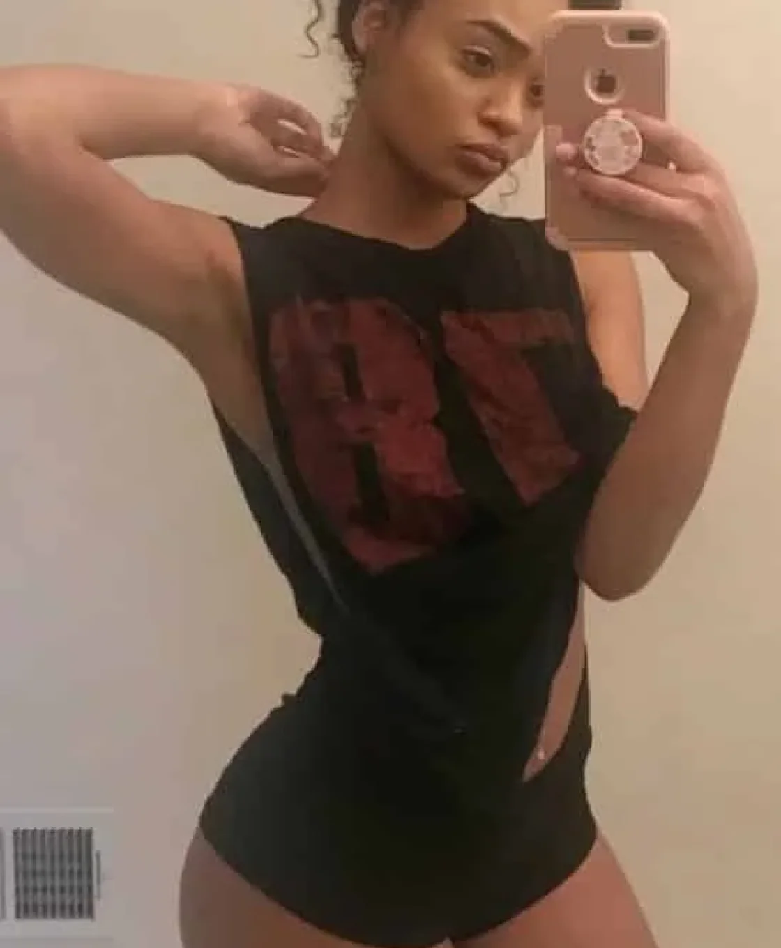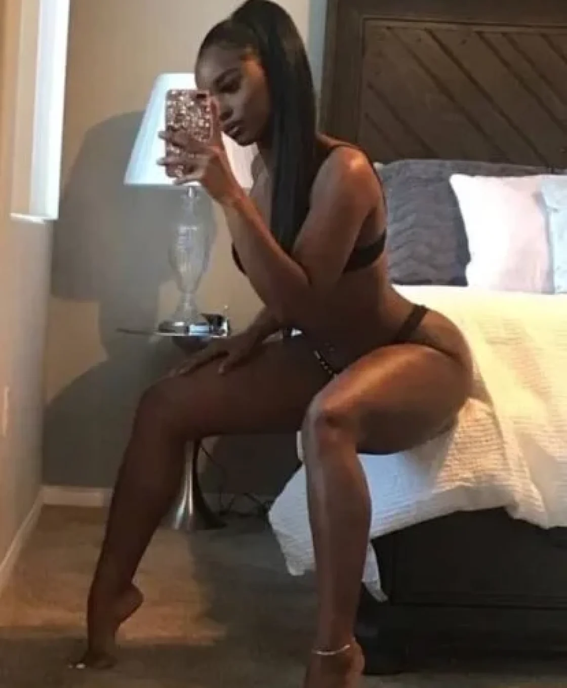 Кожа Ренди выглядит словно отполирована светом — гладкая, насыщенная, тёплая. В сочетании с чёрным бельём её силуэт становится особенно выразительным. На фото она держится легко и естественно, как будто камера просто следует за её естественной энергией. Она не пытается казаться соблазнительной — она такая по природе.